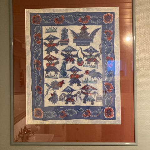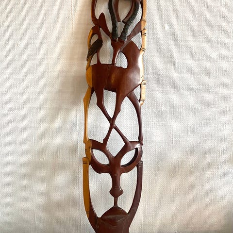 Veggklokken er laget i tre og designet som en stilisert sommerfugl som bærer en rund urskive på ryggen. Passer til veggmontering som dekorativt element; høyde 88cm, bredde 110 cm.