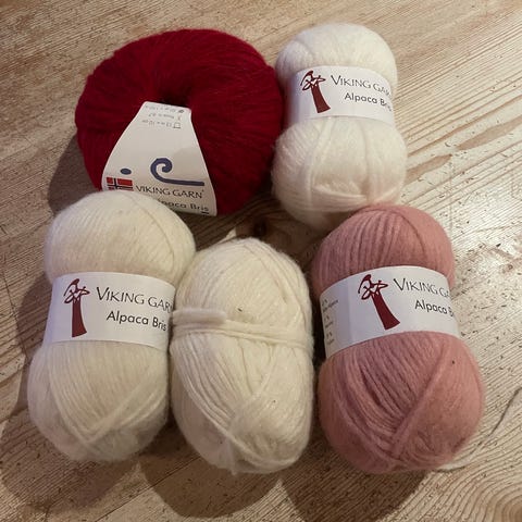 Viking Garn Liten Storm Alpaca garn i lys grå farge. Gjestal Solid Alpakka Ull garn i rød farge. Begge er laget av alpakkaull og egner seg til strikke- og hekleprosjekter.