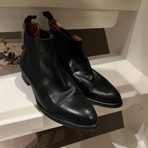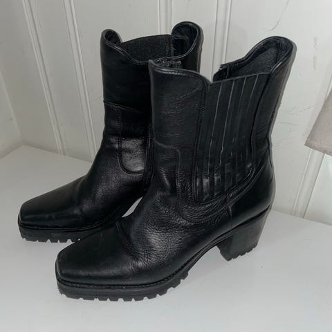 Stockholm Design Group støvler i størrelse 39. Støvlene er svarte og laget av skinn. De har en robust såle og elastiske sider for enkel på- og avkledning.