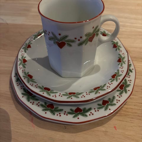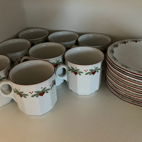servise med dekor i rød og grønn farge. Inkluderer tallerkener, mugge og krydderbøsse. Materiale er porselen. Designet for generell bruk i kjøkken og servering.