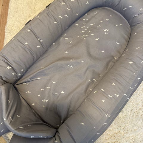Selger babynest fra Voksi med oppbevaringspose. Selges fra et røykfritt og dyrefritt hjem. Kun vasket med parfymefri såpe.