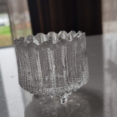 Tung skål i klart glass med dekorative ben. Skålen har en diameter på ca. 17 cm og et unikt design med flere ben som støtter den. Egnet som dekorasjon eller til servering av nøtter.