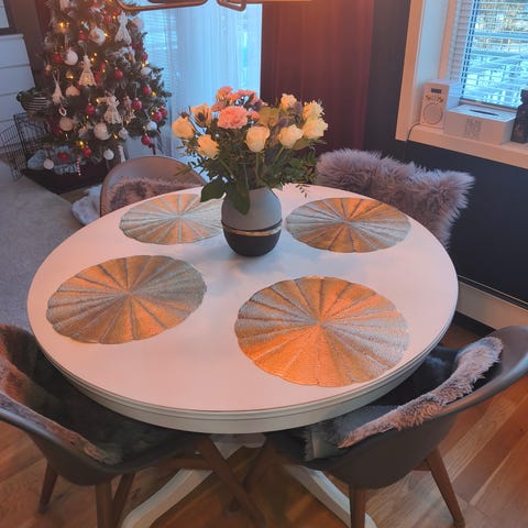 Pent brukt med noen bruksmerker og små riper i plasten som ikke er synlig. Helt supre stoler og behagelige å sitte i.