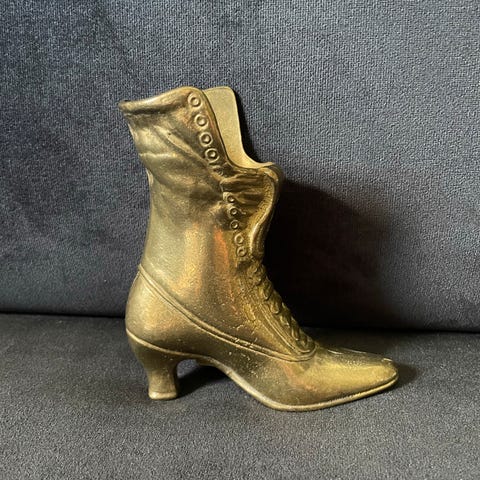 Vintage viktoriansk sko i bronse. Gammel liten viktoriansk damesko. Den kan perfekt brukes som vase eller som en arrangør for penner og blyanter. Høyde - 12 cm. Lengde - 10,5 cm. Diameter. Sirkelhull - 5 cm.