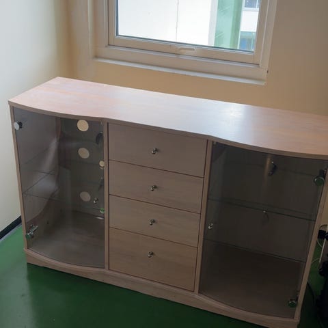 Hel og pen skjenk med glasstopp og glasshylle, samt to skuffer selges rimelig.
