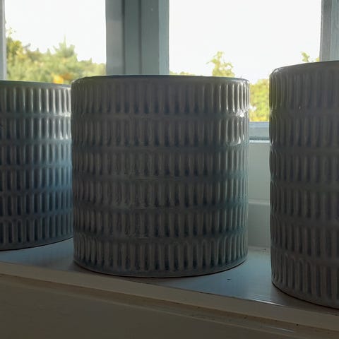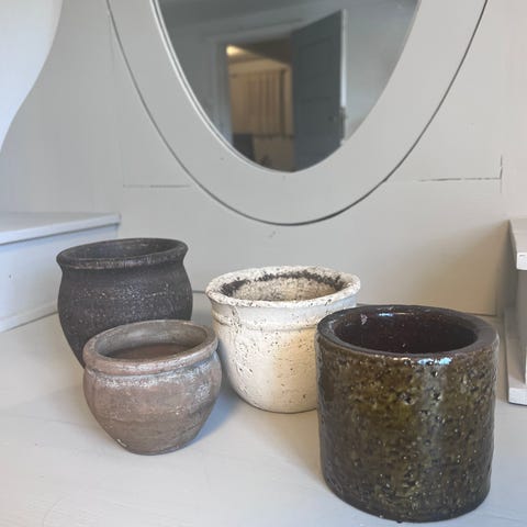 To små kunstige potteplanter i hvite keramikkpotter