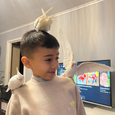 Selger to nymfeparakitter av typen White Face, ca. 6 uker gamle. Begge er svært tamme og sosiale, da de har blitt håndmatet. De er vant til mennesker og håndtering