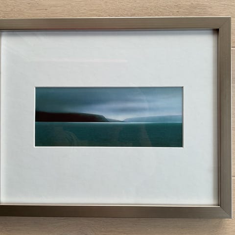 Terje Risberg Møte III kunsttrykk, nummer 15 av 35. Inkluderer signatur og nummerering. Innrammet med mørk ramme gjort av Krane galleri i Tromsø, se liten skrape på rammen. Kjøpt cq 2002, se mer info fra regjeringens kunstsamling.