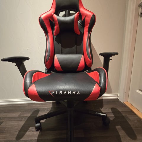 Lite brukt gamingstol i slitesterkt stoff selges. Blå og svart. Kan snurre og heves/senkes. Hjul på beina