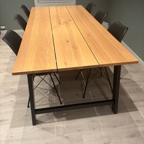 IKEA SKOGSTA spisebord i heltre akasie, størrelse 235 x 100 cm. Solid og robust bord i god stand, med normale bruksspor. Prisen inkluderer 8 stk. TOREBY-stoler i svart imitert skinn. Må hentes.