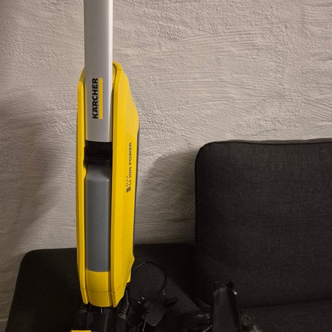 Kärcher FC 5 gulvvasker med kombinasjon av vask og tørk i ett trinn. Designet for effektiv rengjøring av harde gulvflater. Utstyrt med roterende vaskebørster og integrert sugefunksjon for rask tørking. Farge: hvit med gule detaljer.