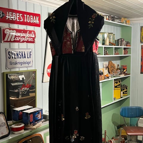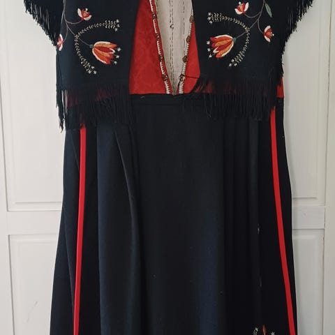 Bryst vidde 89cm, livv 71, skjørte lenge 102 cm, skjorte Hals 35 cm, mansjett 19 cm arm lengde 58 cm skjorte vidde 116 cm. Alt av sølv følger med sko å skinn reim til belte. Kan syes ut ca 22 cm, kun brukt 2 ganger. Følger med bunad pose. Pris kan diskuteres