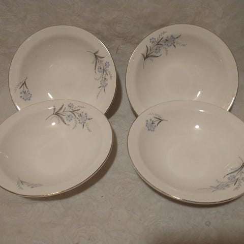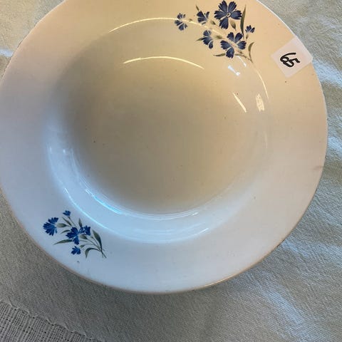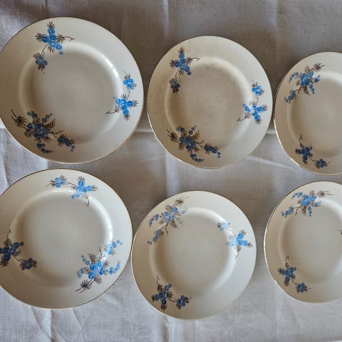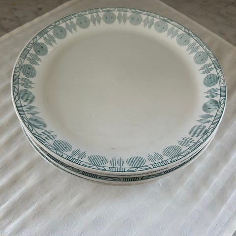 5 frokost tallerkner fra Egersund Fayancefabrikk som heter «Håndmalt alpina».