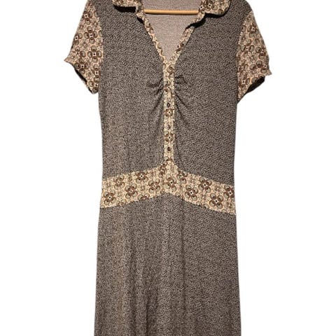 Veldig god og fin kjole selges. Den er tynn, str L, 3/4 ermer, stretchy stoff og fargene er lilla og en slags grønn/ gulfarge.
