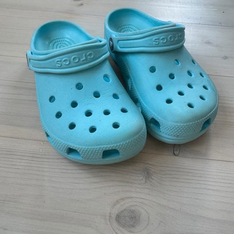 Originale Crocs barnesko i størrelse 35, unisex, i turkis farge. Laget av lett og slitesterkt materiale med ventilasjonshull. Egnet for barn og gir komfortabel passform. Jeg vil si de passer for størrelse 35-37. Veldig lite brukt.