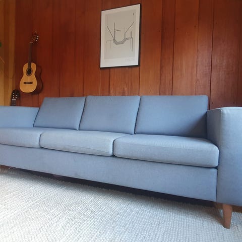 200 cm bred inkl stødige armlener som utgjør ca 16-17 cm på hver side.