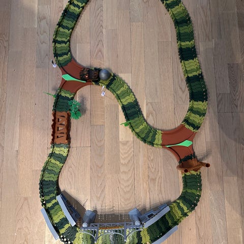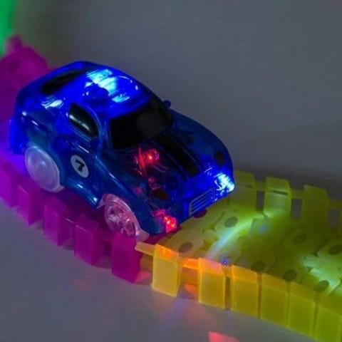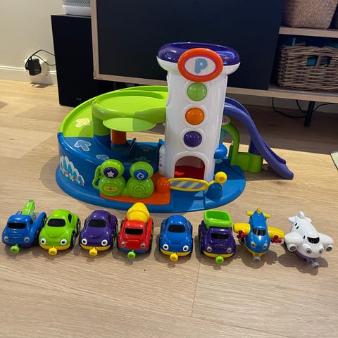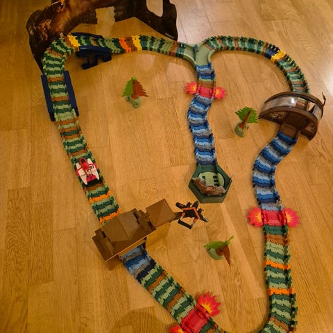 Husker ikke merket men flott bilbane! Bilene som hører med har noen mindre skader, men kan også bruke andre biler på banen. Mye lekemoro med dette.