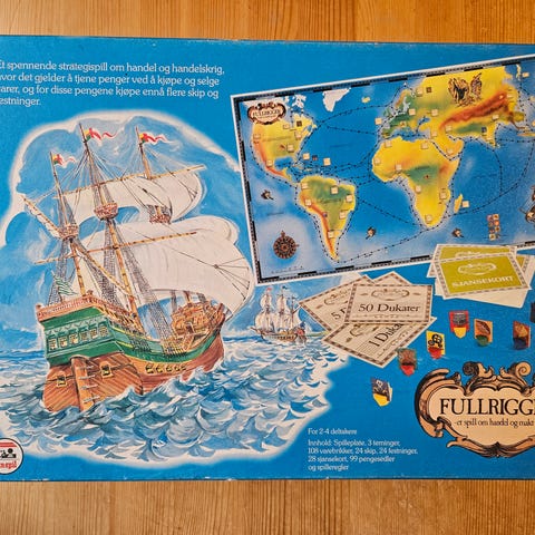 Alga Filibuster brettspill med sjørøverskip-tema. Spillet inkluderer et brett med sjakkbrettmønster i blått, hvitt og gult, samt sjørøverskip-brikker i svart og hvitt.