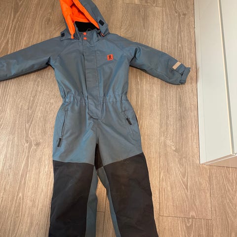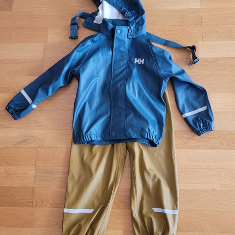 To regnbukser. Størrelse 104. Begge Helly Hansen. Alle fotstrikker er inntakte. Den ene regnbuksa kan strammes med knapp rundt foten.