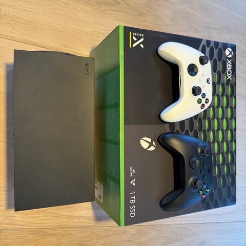 Microsoft Xbox Series X konsoll med kontroller og 5 spill