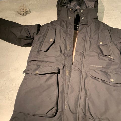 Vattert vinterjakke, vind og vanntett, snøskjørt og håndleddsvarmer. Veldig god allround vinterjakke. Noe tegn til bruk på kanter av mansjetter, samt én flekk på innerside arm. Godt mulig en runde med Vanish vil fjerne disse. Se bilder.