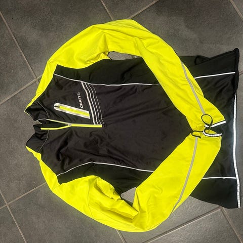 Sykkelløpet for herre i størrelse L. Settet inkluderer jakke, overdel og bukse egnet for sykling ved kjølig temperatur på vår/høst. Materiale og farge er svart, designet for komfort og funksjonalitet under trening.