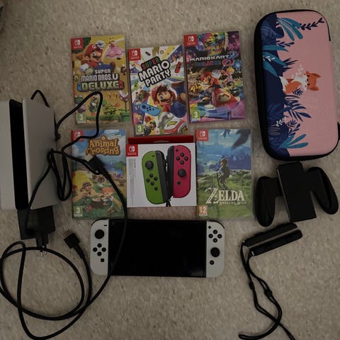 Nintendo Switch konsoll med Joy-Con kontroller og spill