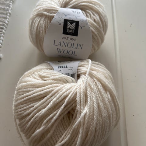 Lanolin wool fra dalegarn. Ca 23 nøster. Et par er rekket opp men like fint å strikke av.