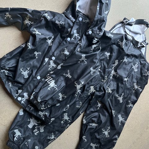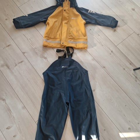 Regntøy fra blåklader, str 104. Brukt noen få ganger av et barn, ingen hull eller slitasje. Fleecefor inni, avtagbar hette, refleks både på bukse og jakke og strikker under beina.