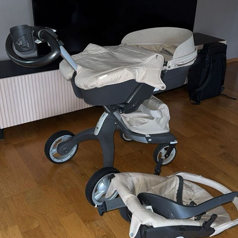 Det følger med liggedel, sportsdel, shoppingbag, regntrekk, myggnett, både vinter og sommer kitt/ sett, nyfødt innlegg, stelleveske med stellematte og koppholder.