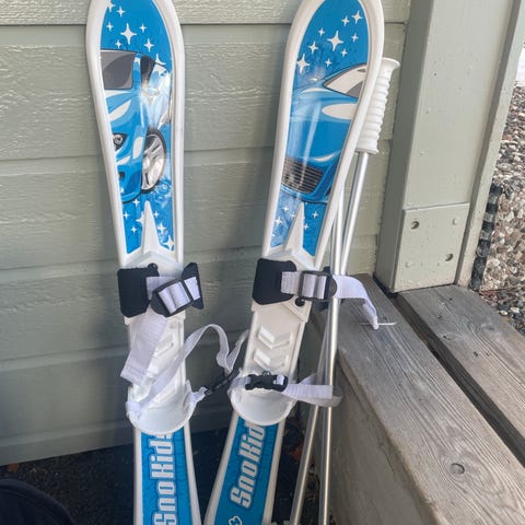 Nesten helt nye rosa snowkids ski med bindinger som kan festes rett på vintersko. Supre førstegangs ski. Kun brukt 2 ganger på veldig korte turer (klistremerket etter den er ny er fortsatt under skien 😅).