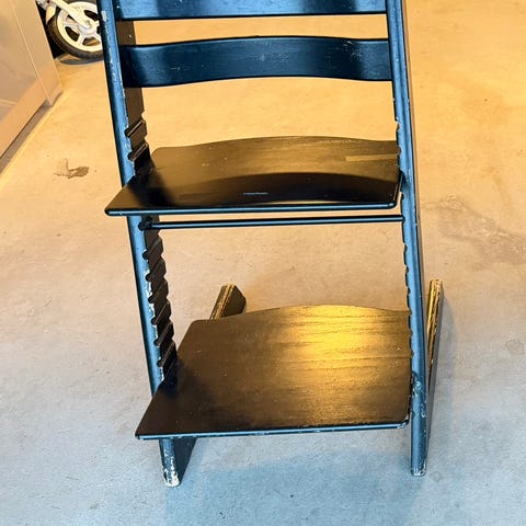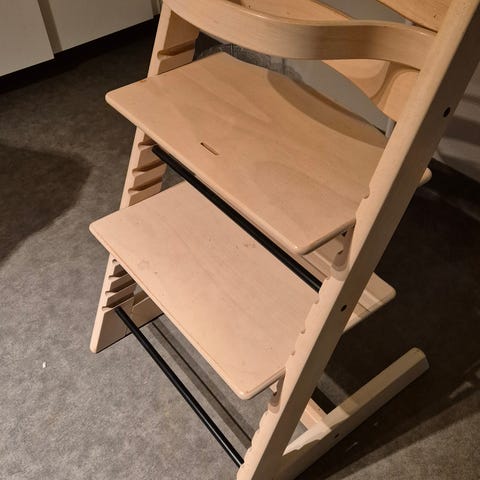 Stokke høy barnestol i tre. Justerbar design som kan tilpasses barnets vekst. Egnet for barn som trenger en høy stol til spisebord eller annen bruk. Usikker på orginal farge da den er malt. Kan være behjelpelig med levering i nærområde