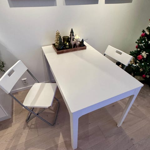 Spisebord i massivt tre fra Ikea. Utgått modell ved navn Ekedalen. Kan slås ut slik at bredden blir 120 cm. Noen bruksmerker, men i god stand.