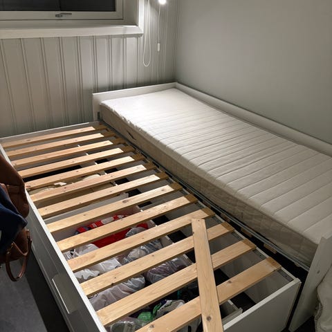 Er godt brukt. Fungerer både som enkeltseng dobbeltseng, men kunne trengt litt kjærlighet og skruer. Tilsvarende som i link https://www.ikea.com/no/no/p/hemnes-dagseng-med-3-skuffer-2-madrasser-hvit-afjaell-medium-s09521500/