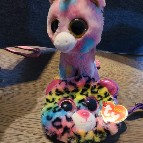 Ty i assorterte farger og modeller, inkludert flere små vesker, en sekk og myke lekedyr. Produktene er laget i myke materialer og passer for barn.