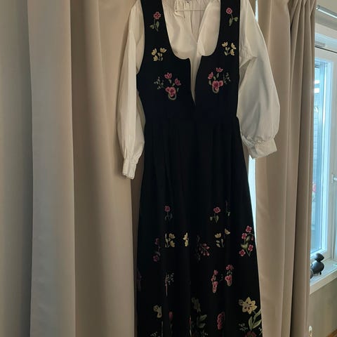 Skjorte, veske, jakke, bunad. Brystv 87, livv 75, lenge skjørt 98. Skjorte str 40, kan syes ut ca 10 cm, følger med litt sølv å bunad pose