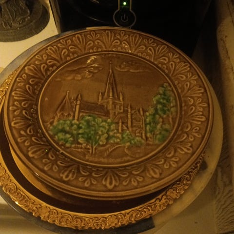 Begge fatene har bølget kant med gullrand og er montert med gullfarget stativ, noe som gir et raffinert, tidløst uttrykk. Resultatet er et lite porselenssmykke – der dansk kvalitet og ombruksdesign møtes.