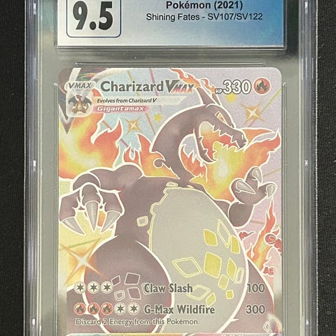 Pokémon Charizard VMAX samlekort med illustrasjon av Charizard i full VMAX-form. Kortet har angrepene Claw Slash og G-Max Wildfire, og viser 320 HP. Kortet er i holografisk design.