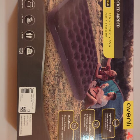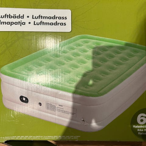 Bilde 1 er kun en illustrasjon. Se også bilder av madrassen som selges. Oppblåsbar komfortabel slitesterk blå enkel luftmadrass m/innebygd pumpe. Oppbevares i originalpose m/bærestropp. Brukt i hjemmet som gjestemadrass 4 netter. Selges + evt frakt