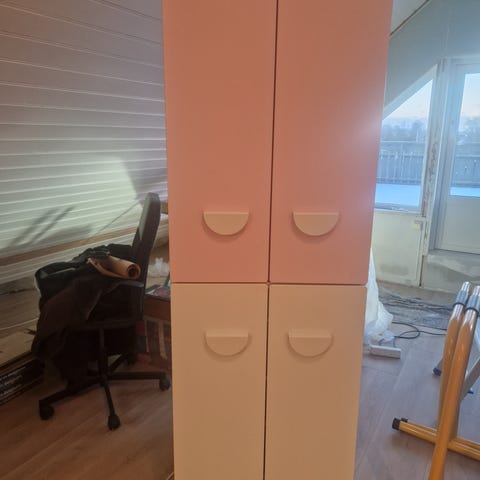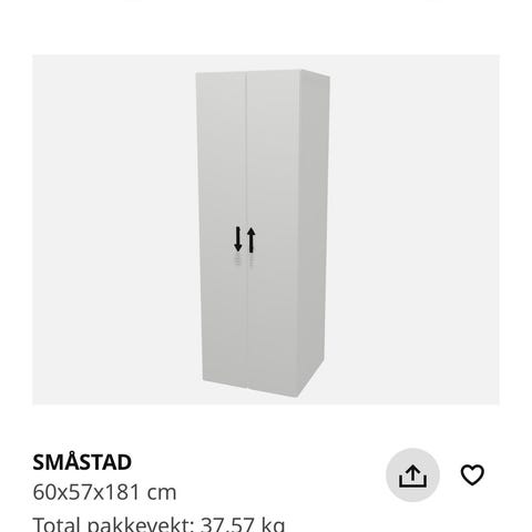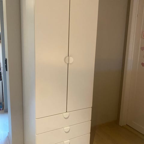 Småstad garderobeskap med hvit stamme og matte sorte dører selges.