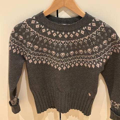 Håndstrikket genser som såvidt er brukt. Ingen nupper, flekker eller skader. Tror aldri den har blitt vasket. Tror den er strikket i mohair. Ca str 6-8 år.
