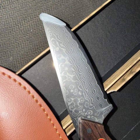 Kniven er hånd smidd med 1095 og 15N20 høy og lav carbon stål, smidd med over 200 lag stål, og bladet er 58 HR (hardhet)