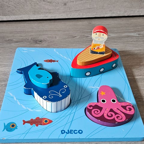 Pakke med superfine treleker fra Djeco. Pop-up-leke, en liten sylinder med treball inni og en stor sylinder med mange små «kuler» i. De to sistnevnte har vært kjempegode å ha på flyturer, vanskelig å miste og fin underholdning.