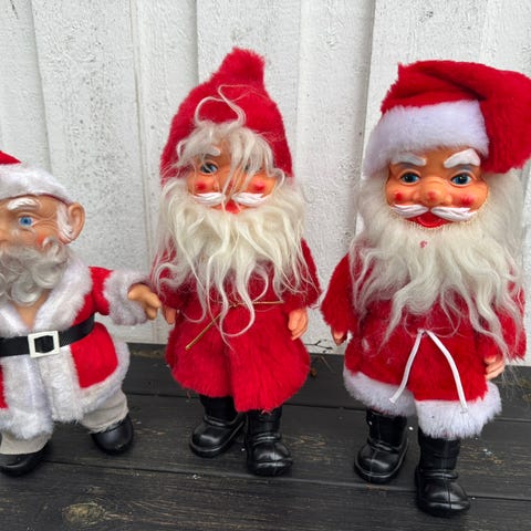 Diverse: To julekopper, nisse med myk kropp og hardt hode, pinner med figurer til å f.eks. stikke ned i potteplanter. En figur til å henge på kanten av blomsterpotte (knekt av en arm). Flettet kurv til f.eks. frukt, snacks, kaker osv. 100,- samlet.