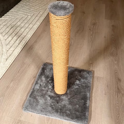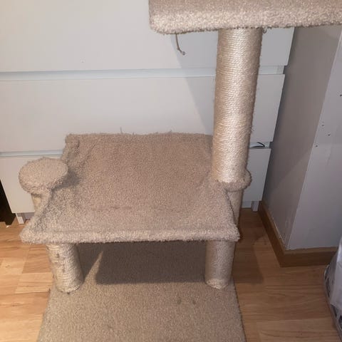 Klatrestativ for katt med flere nivåer, inkludert plattformer, hengekurv og klorestolper. 2 hengende mus i tråd følger også med, kan festes i selve stativet. Laget med mykt stoff og sisal for kloring. Gir kattene mulighet til å klatre, hvile og leke. 1,38 cm. Pent brukt. Kan hentes på Nesttun