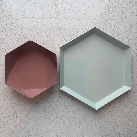 Hay lite dekorasjonsfat i flerfarget metall. Brettet har en rektangulær form med avrundede kanter. Egnet til dekorasjon eller oppbevaring av små gjenstander, er for eksempel plass til to små telys eller nøkkelknippe.