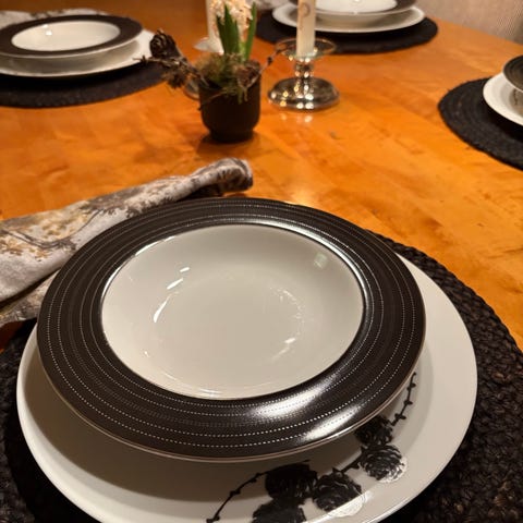 Dekketallerken som kan brukes til både dekketallerken og som serveringsfat. Selger 6 stk, helst samlet. Motivet på tallerkenen er ikke typisk julemotiv, så de kan brukes (etter min mening) hele vinteren.