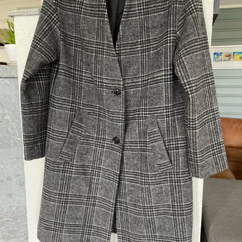 Kåpen er grå, Den har belte i livet og klassisk snitt med krage og lange ermer. Knapt brukt. Veldig fin på med «tungt» stoff som henger fint.