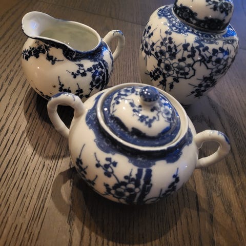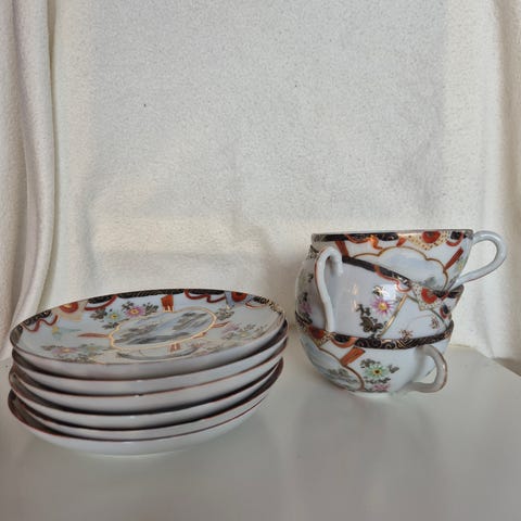 Vintage Kinesisk / japansk porselen tekanne med lokk og to tekopper med dekorative mønstre i oransje, gull og flerfargede detaljer.
