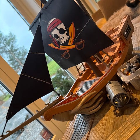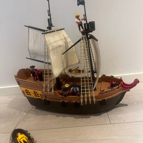 Kjekt Playmobil Piratskip med rødt og svart seil, inkludert flere piratfigurer og tilbehør.
